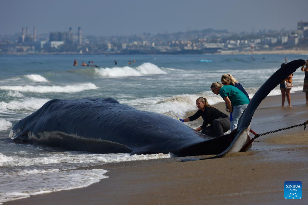 Wildlife specialists try to determine the cause of death of a fin whale washed ashore at Torrance Beach, Los Angeles County, California, the United States on Aug. 11, 2024. The 51-foot-long (about 15.5-meter-long) dead fin whale, washed ashore Saturday evening, died before rescuers could arrive. (Photo by Qiu Chen/Xinhua)