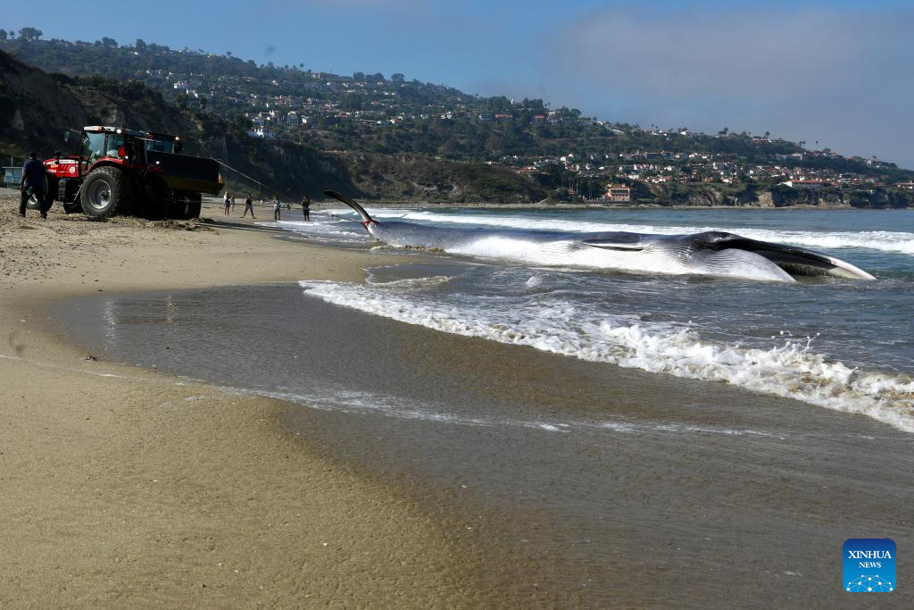 Tractors tow a dead fin whale away from the shoreline of Torrance Beach, Los Angeles County, California, the United States on Aug. 11, 2024. The 51-foot-long (about 15.5-meter-long) dead fin whale, washed ashore Saturday evening, died before rescuers could arrive. (Photo by Qiu Chen/Xinhua)