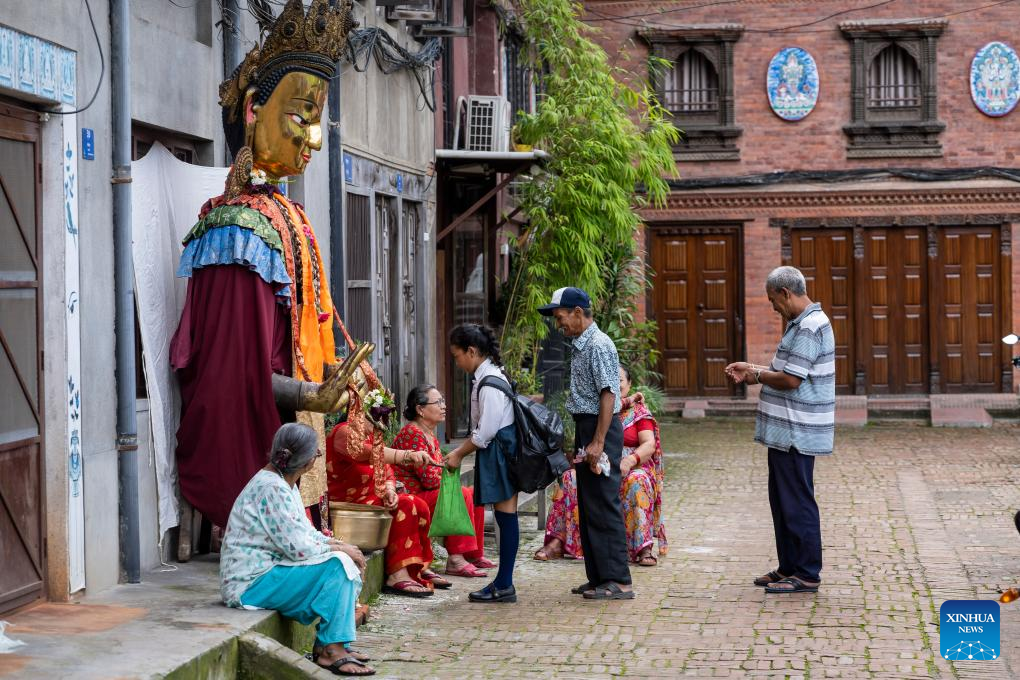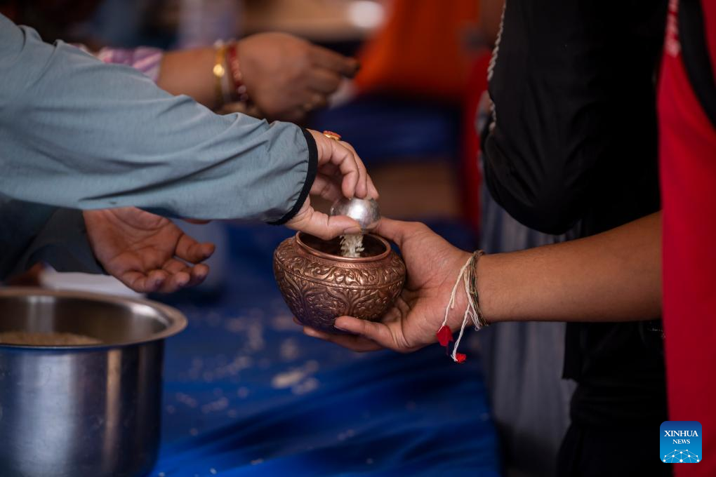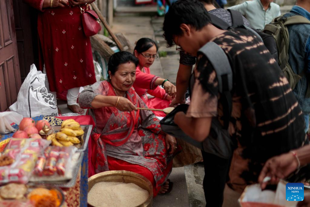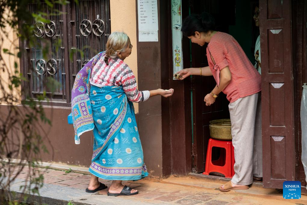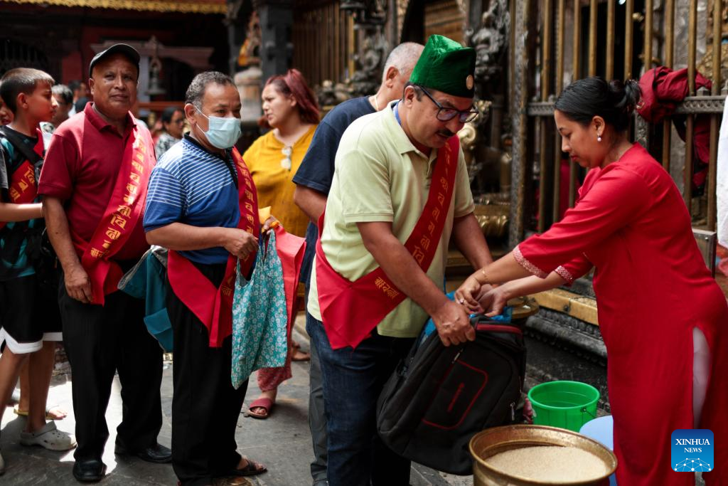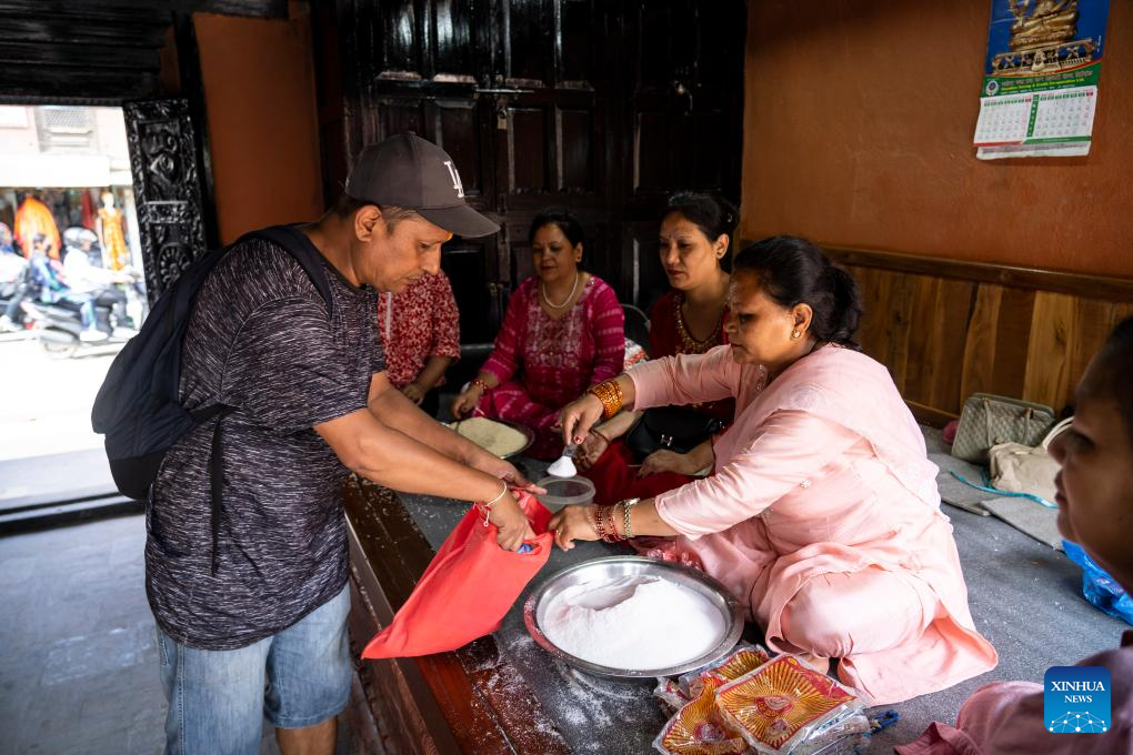 An offering is distributed during the Pancha Dan festival in Lalitpur, Nepal, on Aug. 12, 2024. Pancha Dan, the festival of five summer gifts, is observed by the Buddhists by giving away five elements including wheat grains, rice grains, salt, money and fruit. (Photo by Hari Maharjan/Xinhua)