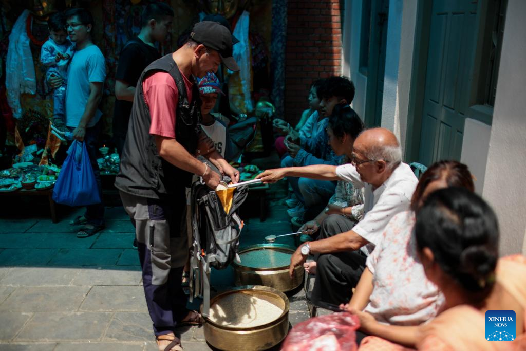 A Buddhist distributes an offering during the Pancha Dan festival in Lalitpur, Nepal, on Aug. 12, 2024. Pancha Dan, the festival of five summer gifts, is observed by the Buddhists by giving away five elements including wheat grains, rice grains, salt, money and fruit. (Photo by Sulav Shrestha/Xinhua)