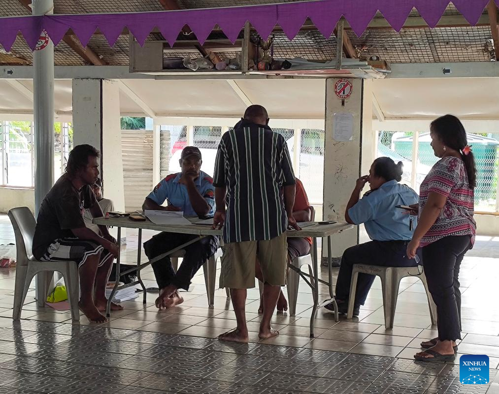 This photo taken with a mobile phone shows voters registering at a polling station in Tarawa, Kiribati, Aug. 14, 2024. Voters in Kiribati on Wednesday went to cast their ballots for the first round of voting in the parliamentary election of the Pacific island country. A total of 114 candidates compete in the first round of voting for 44 parliamentary seats, with a second round on Aug. 19. In the first round of voting, a candidate is elected if receiving more than 50 percent of the ballots cast. A second round is held when not all seats are filled. (Xinhua)