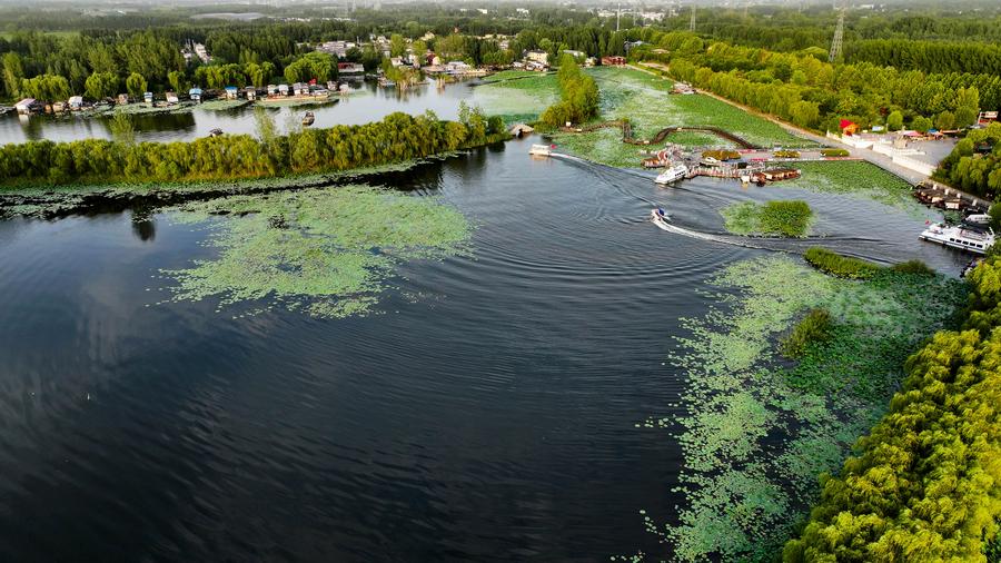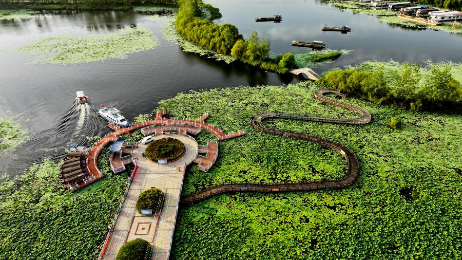 JINAN, Aug. 14 (Xinhua) -- Weishan County in Jining City, east China's Shandong Province is renowned for its wetland ecosystem as it has stepped up ecological conservation and green development in recent years. Currently, about 160,000 mu (10,666.67 hectares) of wetlands have been restored and protected here.
