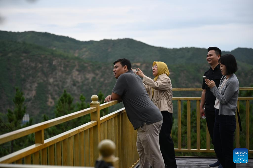 Delegates visit Ma'anshan forest farm in Harqin Banner, Chifeng City, north China's Inner Mongolia Autonomous Region, Aug. 13, 2024. A group of delegates from countries including Laos, Indonesia, the United States and Japan have praised China's high-quality development through ecological environmental protection and harmonious coexistence between humans and nature.(Xinhua/Wang Xuebing)