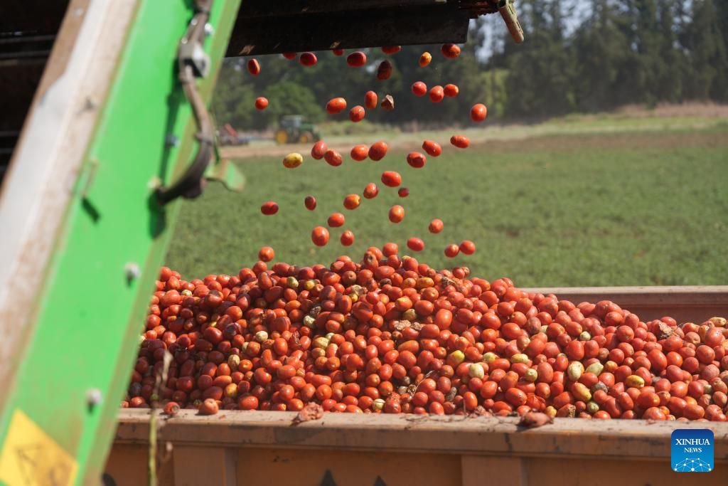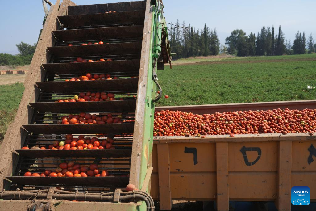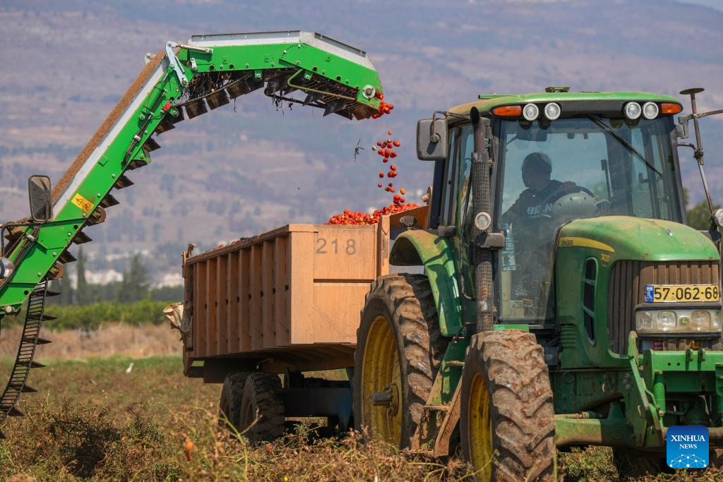 This photo taken on Aug. 13, 2024 shows a farm machine loading harvested tomatoes onto a truck at the Hula Valley, Israel. (Ayal Margolin/JINI via Xinhua)