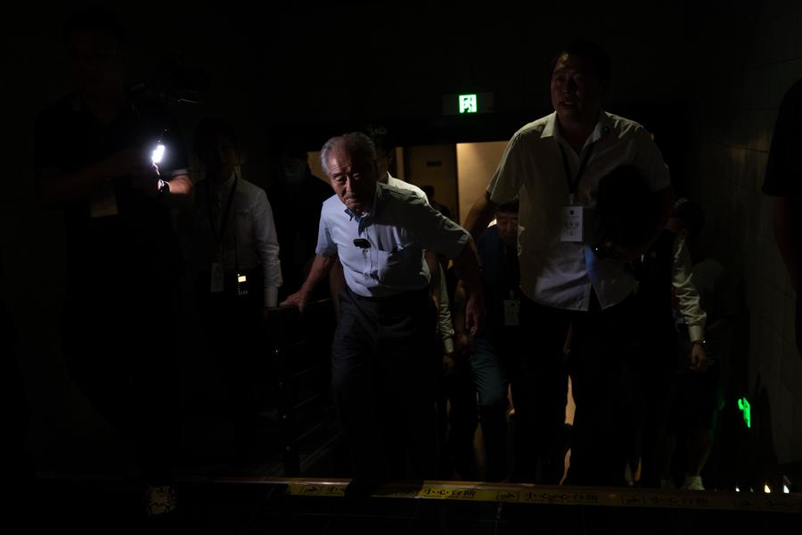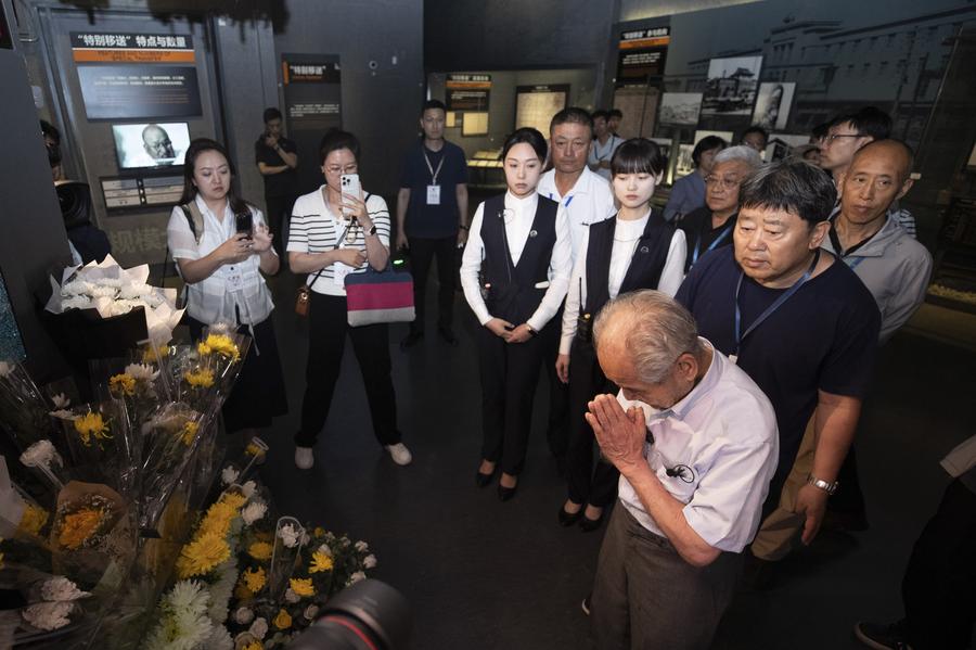 Hideo Shimizu prays in front of the list of victims at the Exhibition Hall of Evidences of Crime Committed by Unit 731 of the Japanese Imperial Army in Harbin, northeast China's Heilongjiang Province, Aug. 13, 2024. (Xinhua/Wang Jianwei)