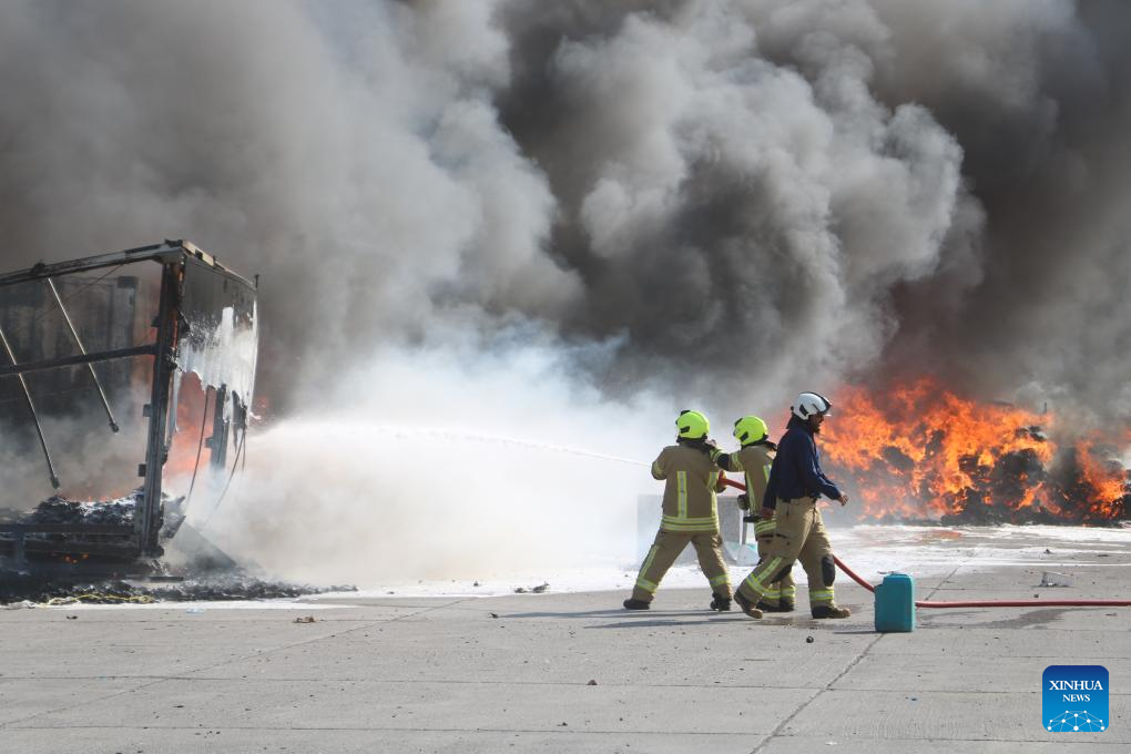 Rescuers try to extinguish fire at a customs' parking lot in Herat city, Afghanistan, Aug. 14, 2024. Several trucks carrying commercial goods have turned to ash as customs' parking lot caught fire in Herat city, the provincial capital of the western Afghanistan's Herat province, deputy to the Customs' office Mawlawi Esmatullah Yasar said Thursday. (Photo by Mashal/Xinhua)