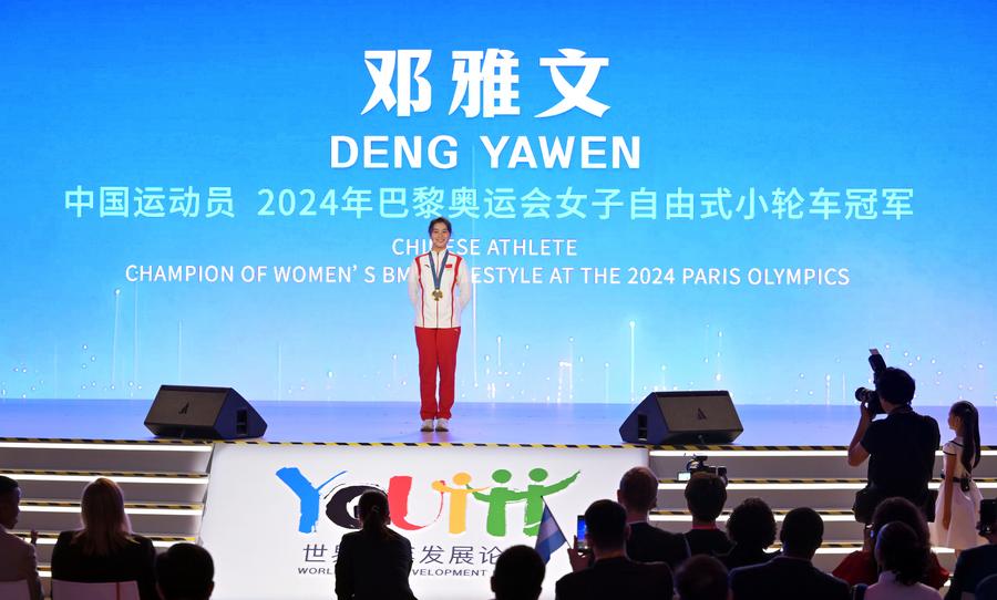 Deng, 18, won gold in the women's BMX Freestyle competition on July 31. She briefly shared her story on the sidelines of the ongoing 2024 World Youth Development Forum that opened in Beijing earlier this week.