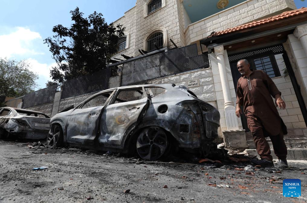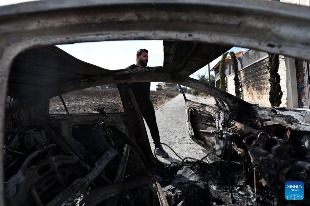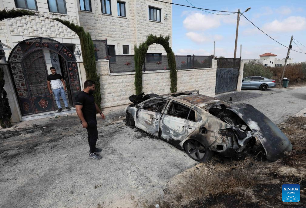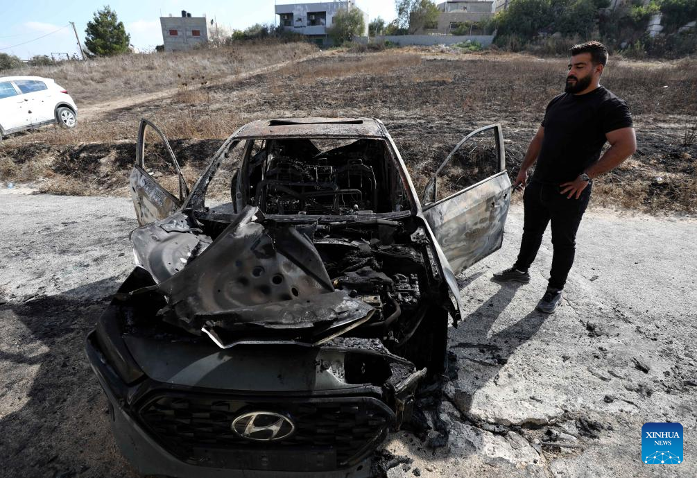 A Palestinian man inspects a car burned during Israeli settlers' attack the day before in the town of Jit in Qalqilya, northern West Bank, on Aug. 16, 2024. A Palestinian was killed and another critically injured by gunfire from Israeli settlers in Qalqilya, the Palestinian Ministry of Health reported on Thursday. (Photo by Ayman Nobani/Xinhua)