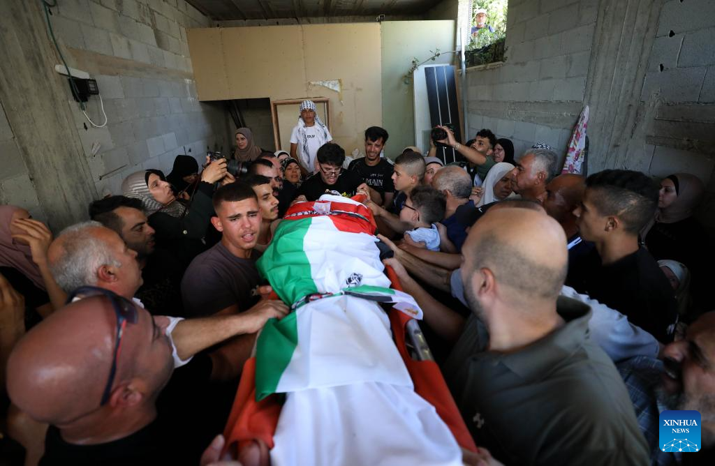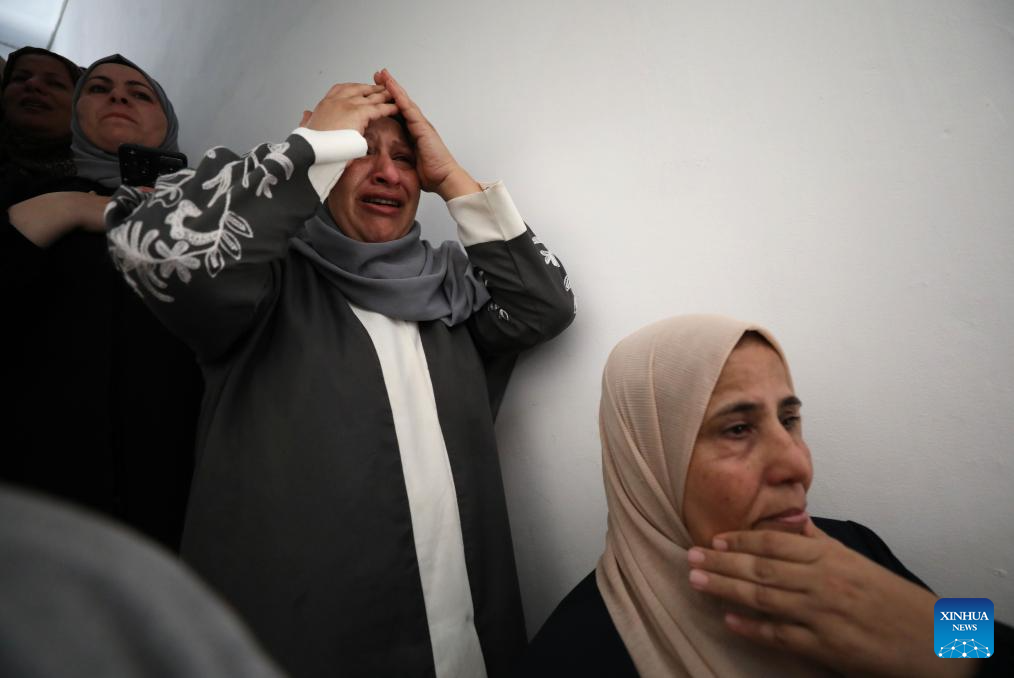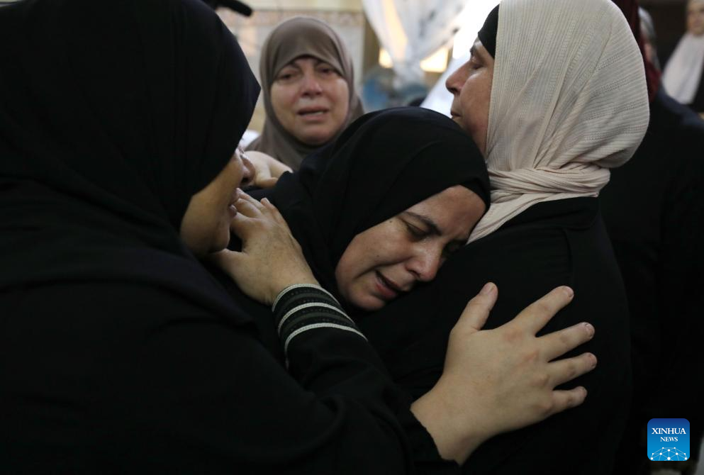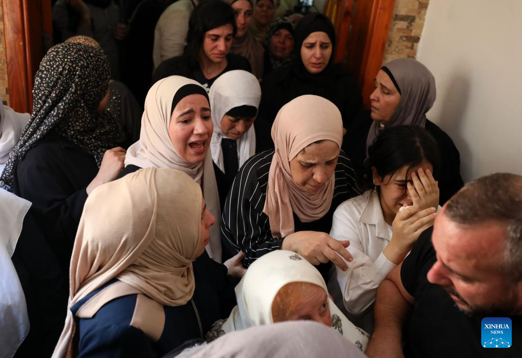 People mourn during the funeral of Palestinian Rashid Abdul Qader Sada in Qalqilya, northern West Bank, on Aug. 16, 2024. Sada was killed and another critically injured by gunfire from Israeli settlers in Qalqilya, the Palestinian Ministry of Health reported on Thursday. (Photo by Ayman Nobani/Xinhua)