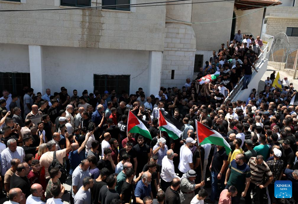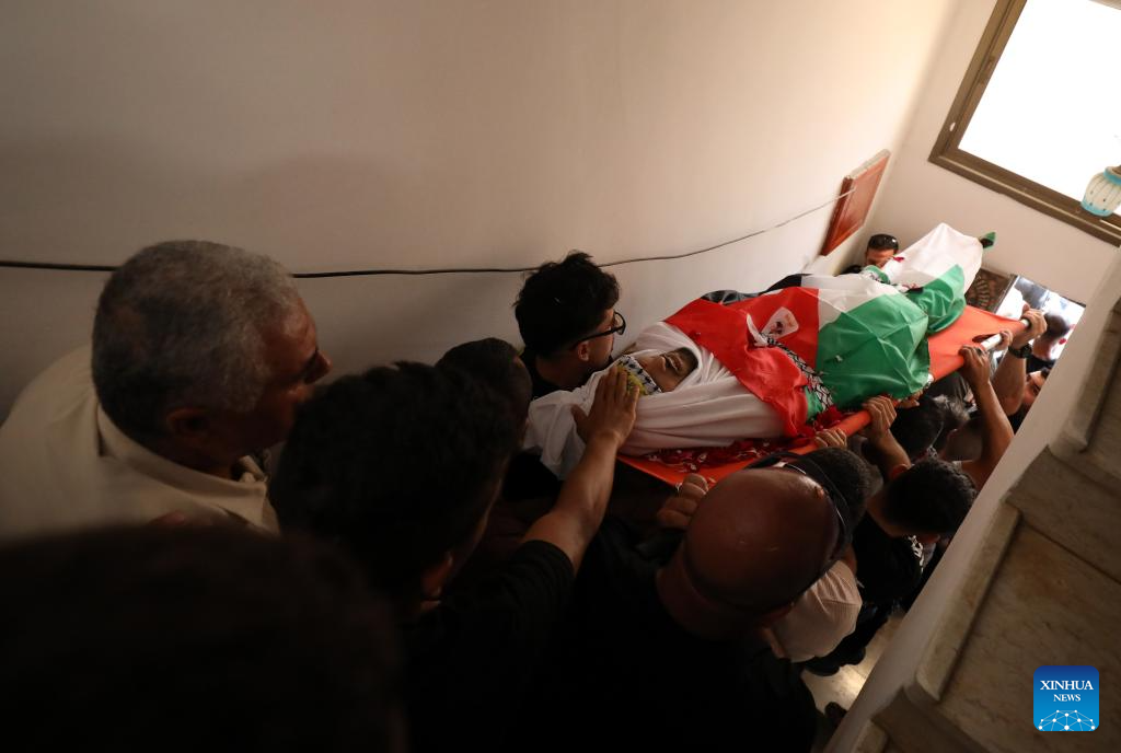 Mourners carry the body of Palestinian Rashid Abdul Qader Sada during his funeral in Qalqilya, northern West Bank, on Aug. 16, 2024. Sada was killed and another critically injured by gunfire from Israeli settlers in Qalqilya, the Palestinian Ministry of Health reported on Thursday. (Photo by Ayman Nobani/Xinhua)
