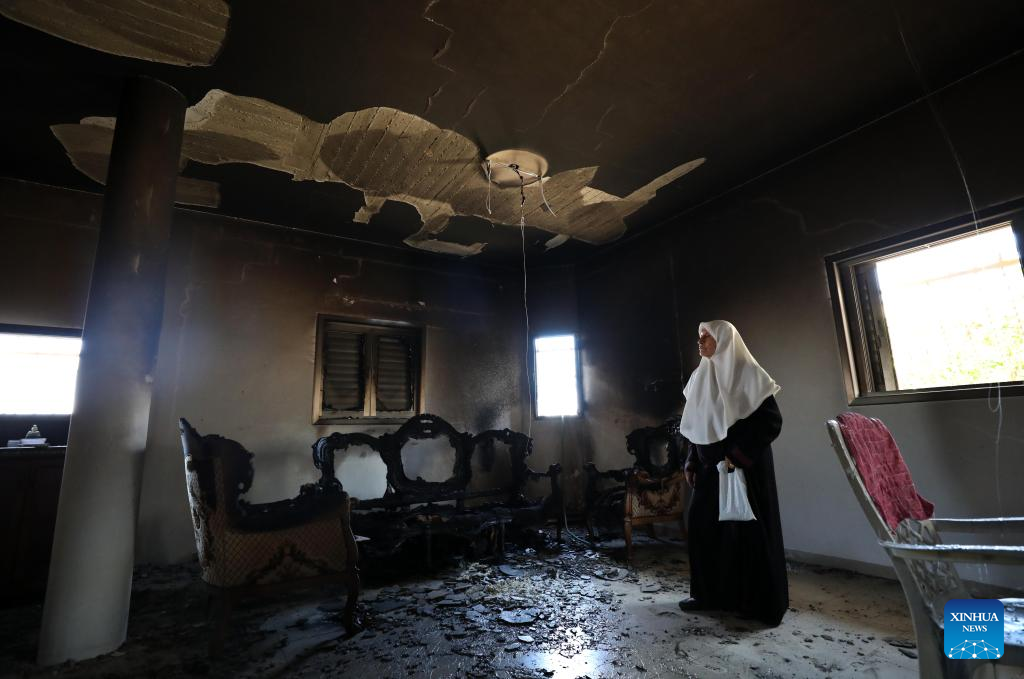 A Palestinian woman inspects a house burned during Israeli settlers' attack the day before in the town of Jit in Qalqilya, northern West Bank, on Aug. 16, 2024. A Palestinian was killed and another critically injured by gunfire from Israeli settlers in Qalqilya, the Palestinian Ministry of Health reported on Thursday. (Photo by Ayman Nobani/Xinhua)