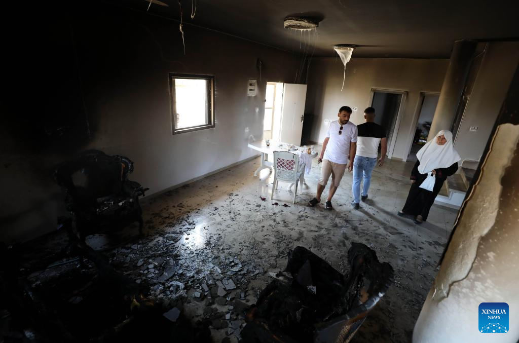 Palestinians inspect a house burned during Israeli settlers' attack the day before in the town of Jit in Qalqilya, northern West Bank, on Aug. 16, 2024. A Palestinian was killed and another critically injured by gunfire from Israeli settlers in Qalqilya, the Palestinian Ministry of Health reported on Thursday. (Photo by Ayman Nobani/Xinhua)