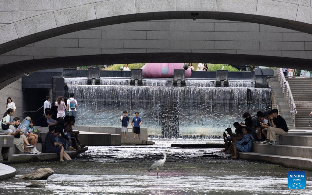 People cool off by the fountain in Seoul, South Korea, Aug. 16, 2024. (Photo by Jun Hyosang/Xinhua)