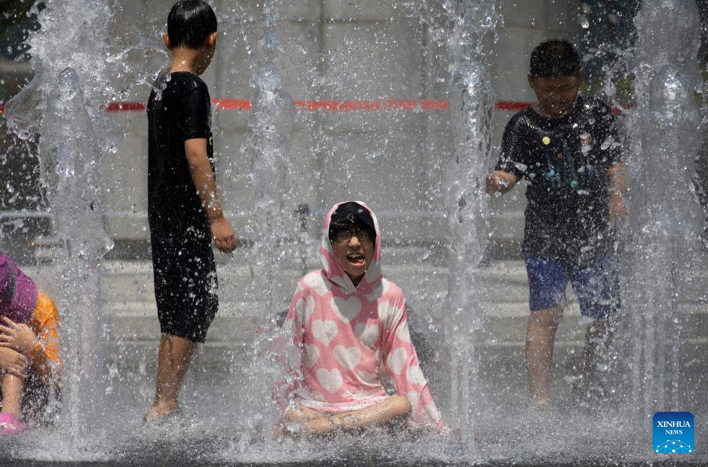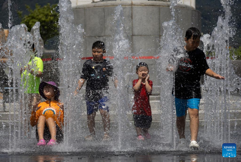 Children play in the fountain amid a heatwave in Seoul, South Korea, Aug. 16, 2024. (Photo by Jun Hyosang/Xinhua)