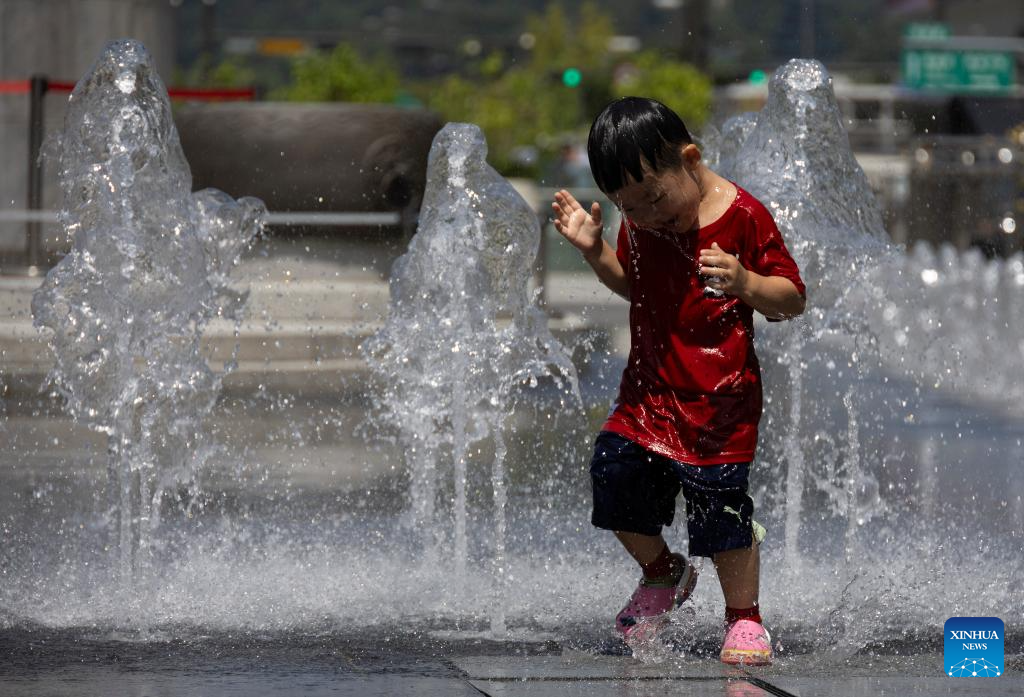 A boy plays in the fountain amid a heatwave in Seoul, South Korea, Aug. 16, 2024. (Photo by Jun Hyosang/Xinhua)