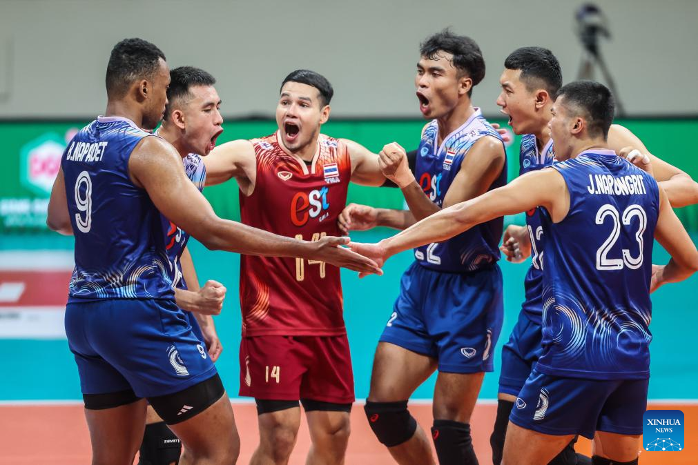 Players of Thailand celebrate after scoring a point during the match between Thailand and Indonesia in the 1st leg of the Men's SEA Volleyball League in Manila, the Philippines, Aug. 16, 2024. (Xinhua/Rouelle Umali)