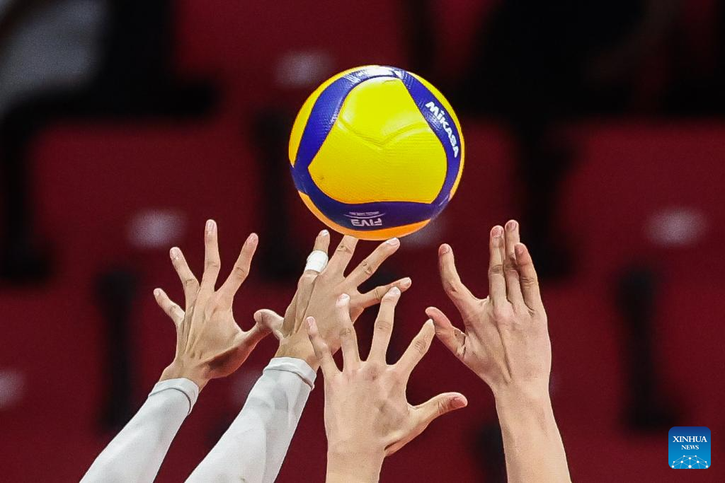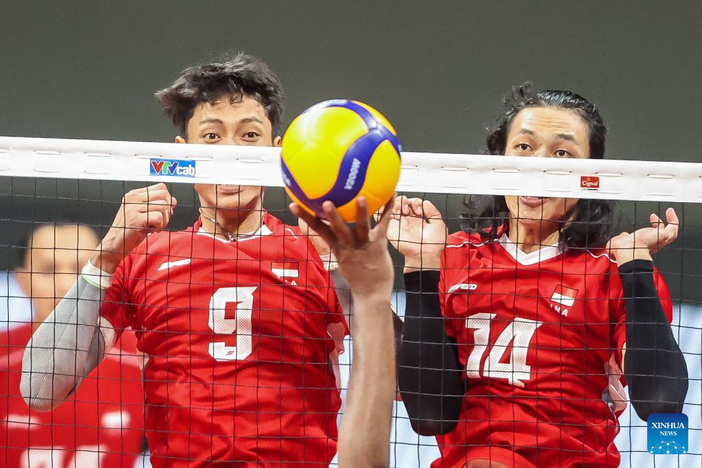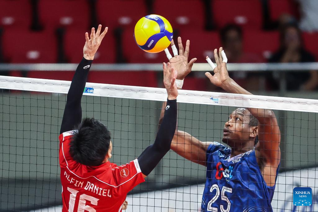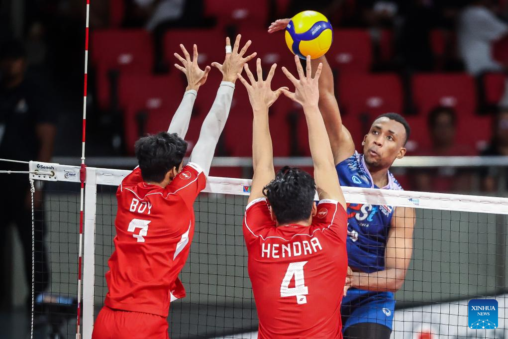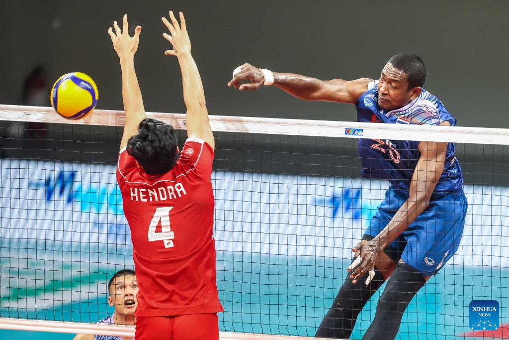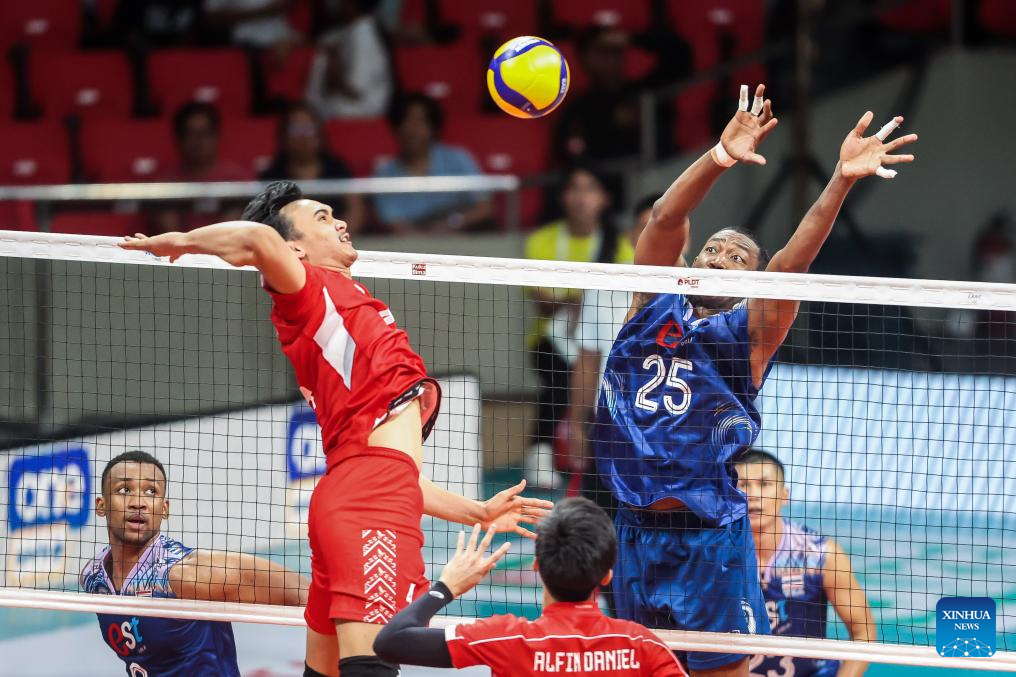 Players from Indonesia compete against Thailand during the match in the 1st leg of the Men's SEA Volleyball League in Manila, the Philippines, Aug. 16, 2024. (Xinhua/Rouelle Umali)