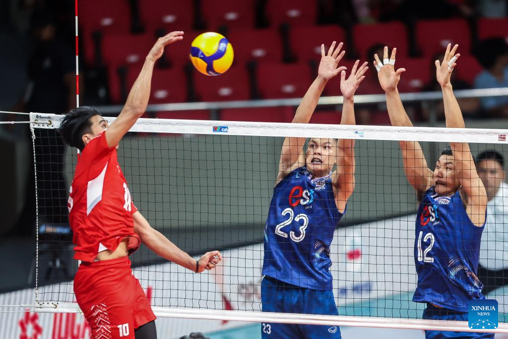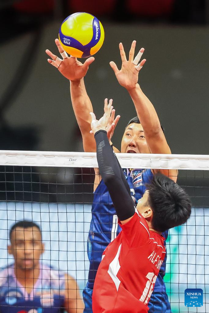 Kissada Nilsawai (R) of Thailand competes during the match between Thailand and Indonesia in the 1st leg of the Men's SEA Volleyball League in Manila, the Philippines, Aug. 16, 2024. (Xinhua/Rouelle Umali)