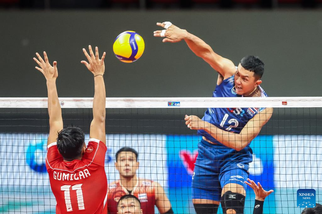 Napadet Bhinijdee (R) of Thailand spikes the ball during the match between Thailand and Indonesia in the 1st leg of the Men's SEA Volleyball League in Manila, the Philippines, Aug. 16, 2024. (Xinhua/Rouelle Umali)