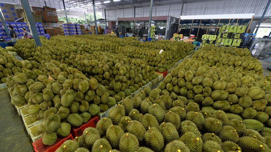 Durians are seen at a processing factory in Chanthaburi, Thailand, May 7, 2024. (Xinhua/Rachen Sageamsak)