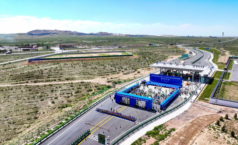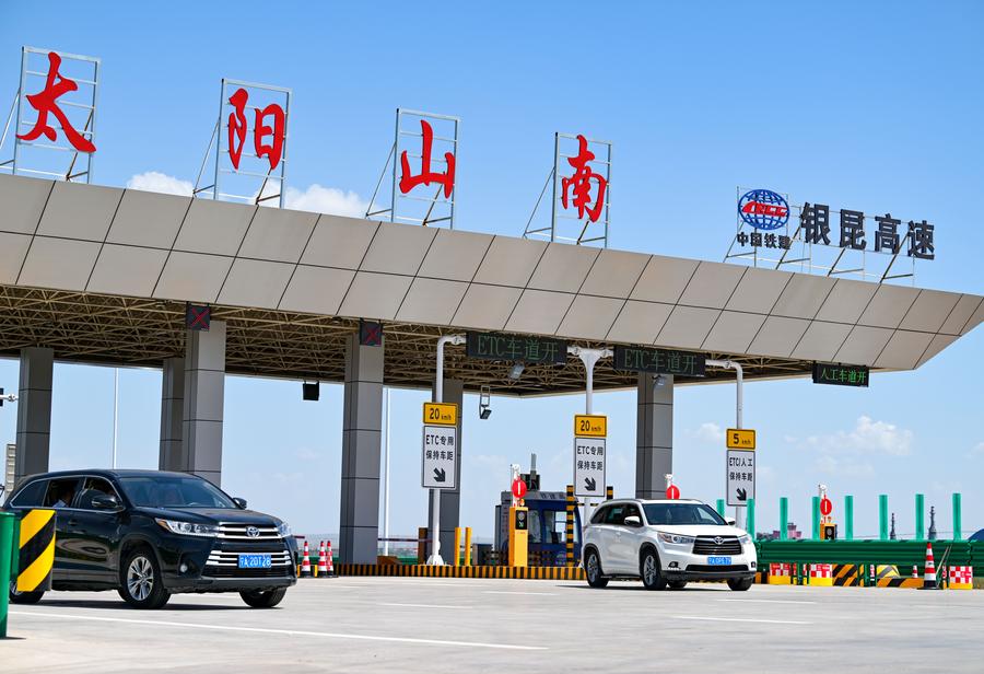 Vehicles leave Taiyangshan south toll gate along the Yinchuan-Kunming highway in northwest China's Ningxia Hui Autonomous Region, Aug. 16, 2024. (Xinhua/Feng Kaihua)