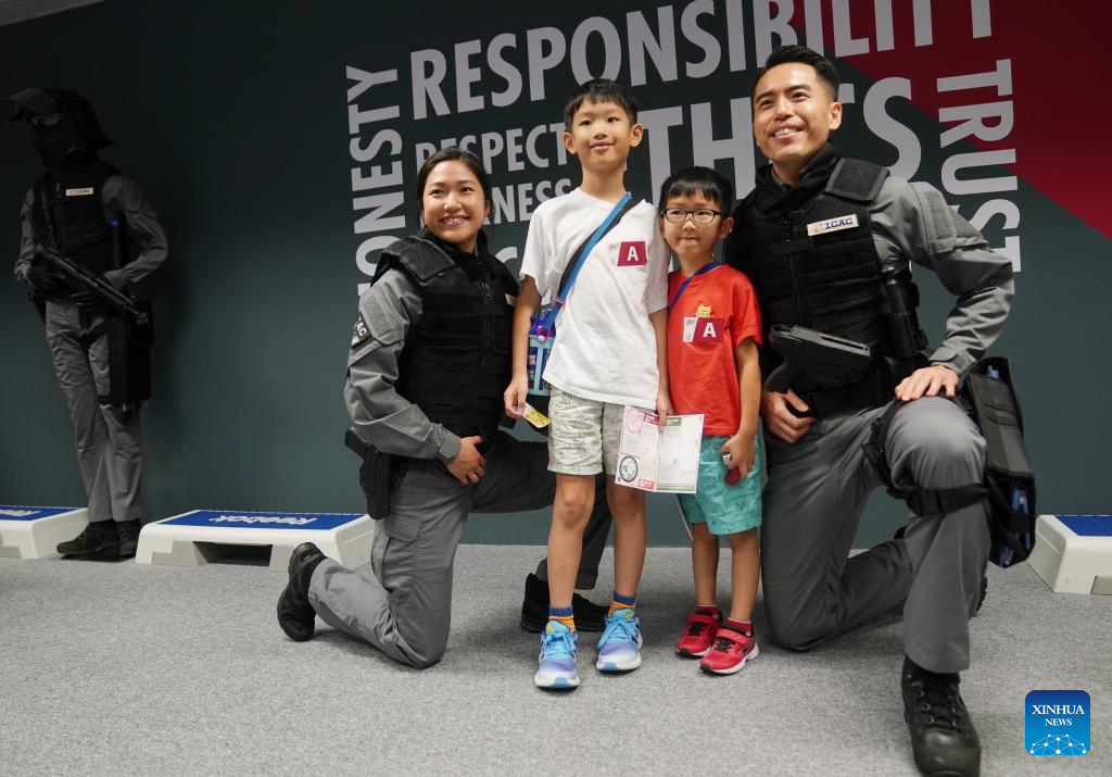 Children pose for a group photo with armed officers at the building of the Independent Commission Against Corruption (ICAC) in Hong Kong, south China, Aug. 17, 2024. (Xinhua/Wang Shen)