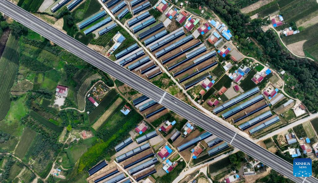 This aerial drone photo taken on Aug. 16, 2024 shows vehicles running past the Pengyang north toll gate to Yinchuan-Kunming highway in Pengyang County of Guyuan City, northwest China's Ningxia Hui Autonomous Region. A section of the Yinchuan-Kunming highway within Ningxia, from Taiyangshan development zone to Pengyang, was completed and opened to traffic on Friday, marking the full opening of the Yinchuan-Kunming highway.