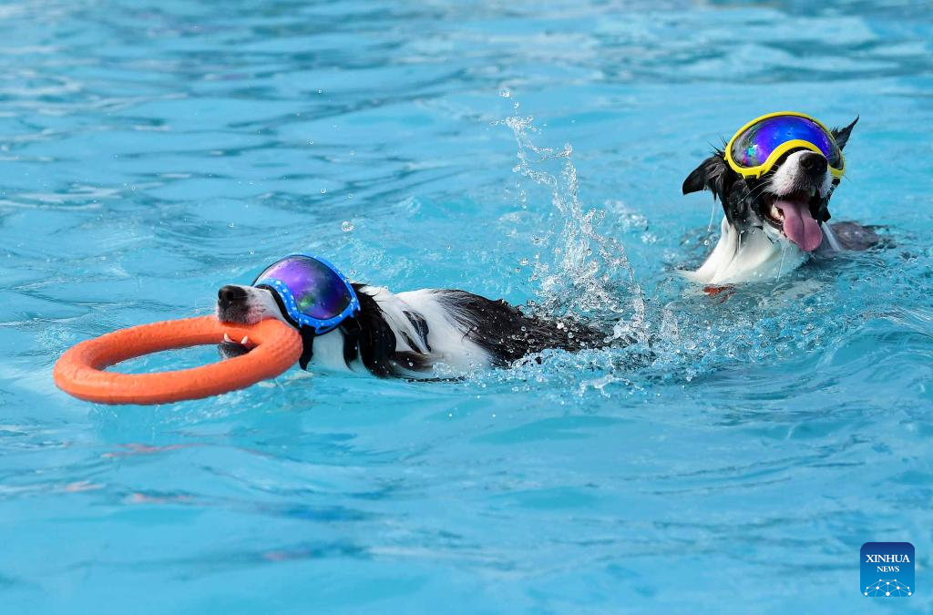 Dogs swim in a makeshift swimming pool in Seoul, South Korea, Aug. 18, 2024. An event for dogs and dog owners to cool off amid the heat wave is held at a swimming pool in Seoul. (Photo by Jun Hyosang/Xinhua)