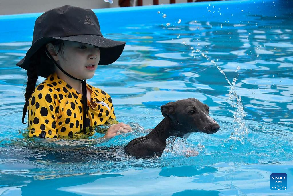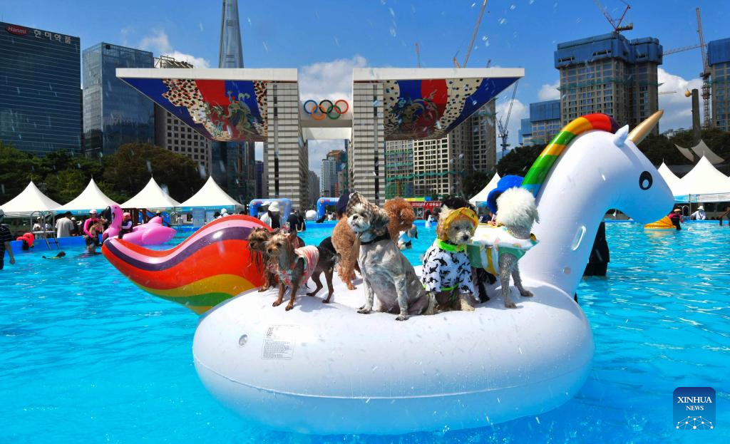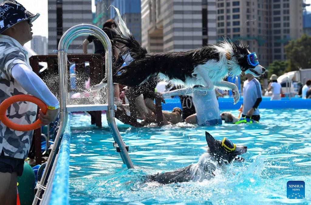 Dogs have fun in a makeshift swimming pool in Seoul, South Korea, Aug. 18, 2024. An event for dogs and dog owners to cool off amid the heat wave is held at a swimming pool in Seoul. (Photo by Jun Hyosang/Xinhua)