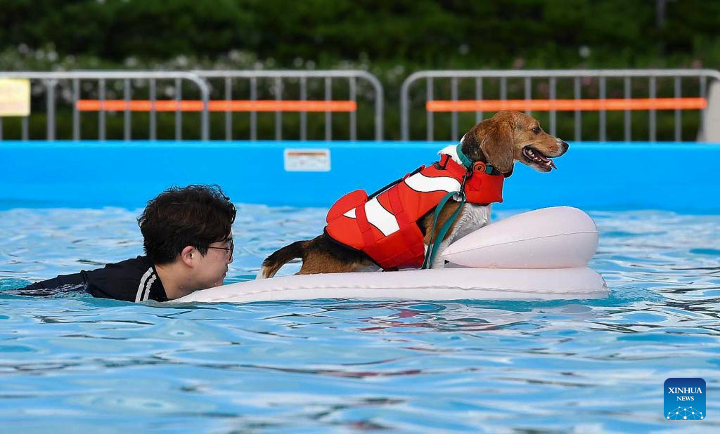 A dog swims in a makeshift swimming pool in Seoul, South Korea, Aug. 18, 2024. An event for dogs and dog owners to cool off amid the heat wave is held at a swimming pool in Seoul. (Photo by Jun Hyosang/Xinhua)