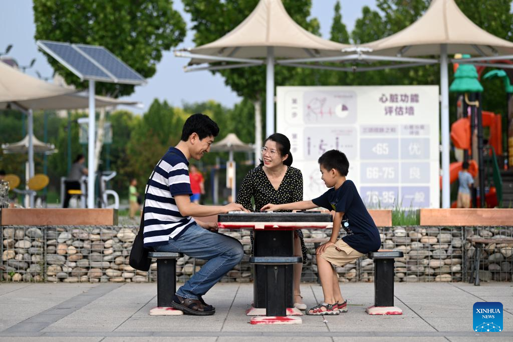 Song Lijun (L) and Wang Li (C) play Chinese chess with their son at a park in north China's Tianjin, Aug. 18, 2024.
