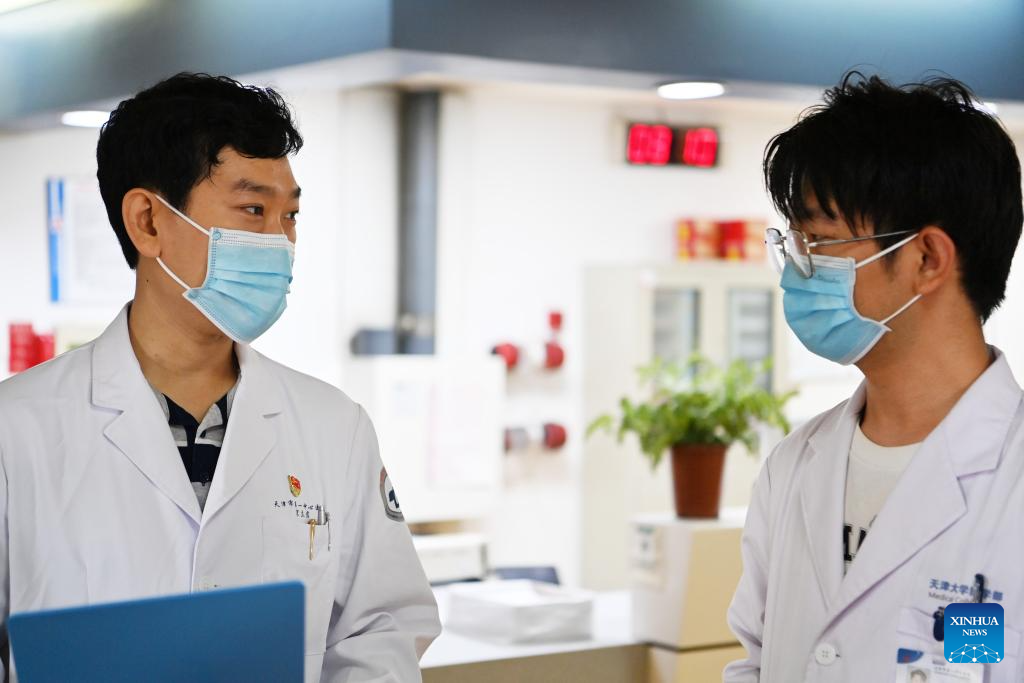 Song Lijun (L) talks with a medical student at the Fukang Road branch of Tianjin First Central Hospital in north China's Tianjin, Aug. 16, 2024.