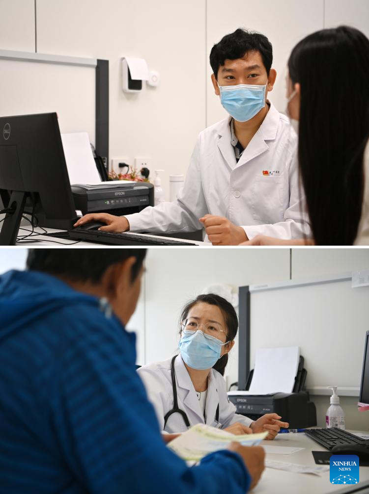 This combo photo shows Song Lijun (L) treating a patient on Aug. 18, 2024, and Wang Li providing outpatient service on Aug. 16, 2024, in Shuixi branch of Tianjin First Central Hospital in north China's Tianjin.