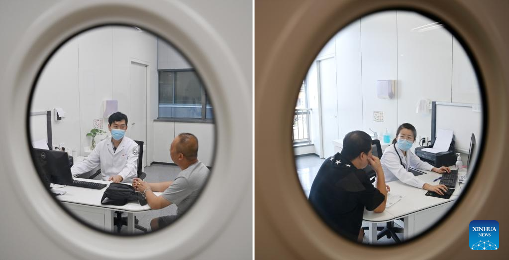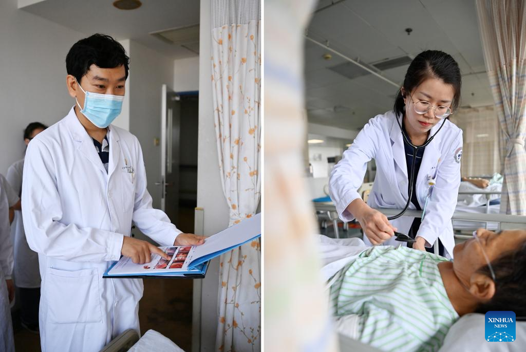 This combo photo shows Song Lijun (L) doing a ward round on Aug. 16, 2024, and Wang Li making a ward round on Aug. 15, 2024, in Fukang Road branch of Tianjin First Central Hospital in north China's Tianjin.