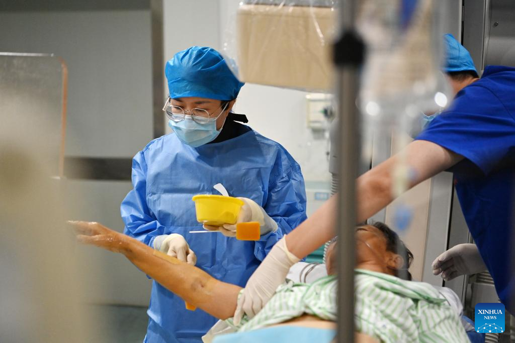 Wang Li disinfects a patient at the Fukang Road branch of Tianjin First Central Hospital in north China's Tianjin, Aug. 15, 2024.
