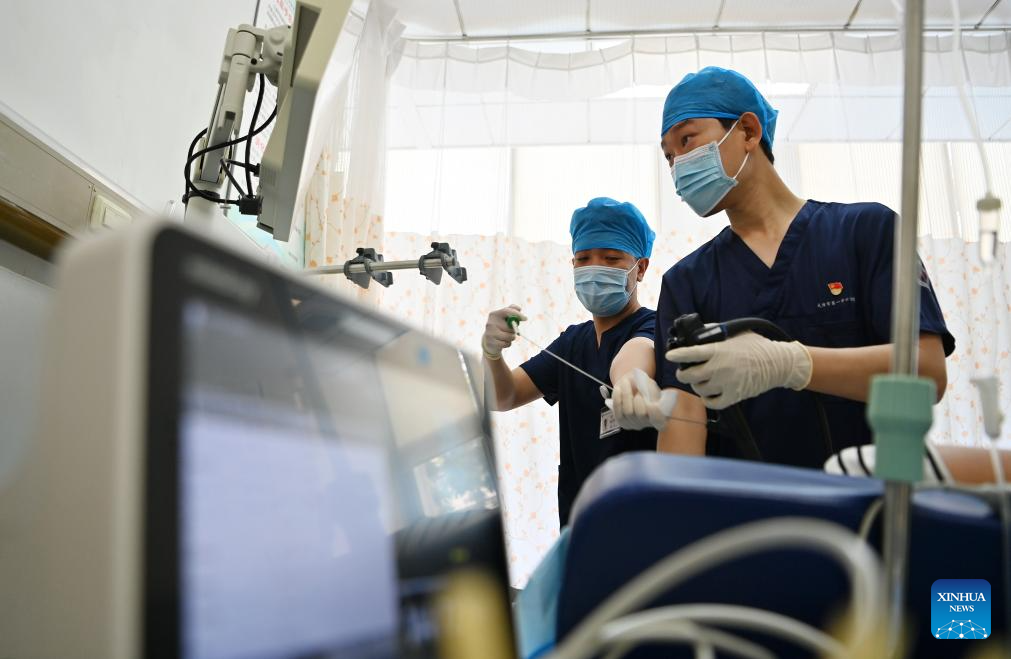 Song Lijun (R) performs a gastroscope inspection on a patient at the Fukang Road branch of Tianjin First Central Hospital in north China's Tianjin, Aug. 16, 2024.