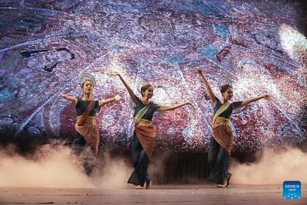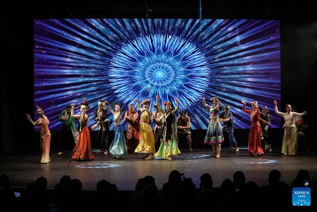 Dancers from China's Northwest Minzu University perform at the "Colors of China: Ethnic Kaleidoscope" evening gala in Sao Paulo, Brazil, Aug. 18, 2024. (Photo by Paulo Lopes/Xinhua)