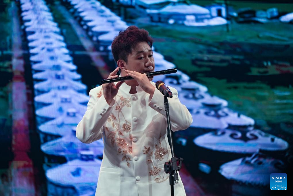 An artist from China's Northwest Minzu University performs a flute solo at the "Colors of China: Ethnic Kaleidoscope" evening gala in Sao Paulo, Brazil, Aug. 18, 2024. (Photo by Paulo Lopes/Xinhua)