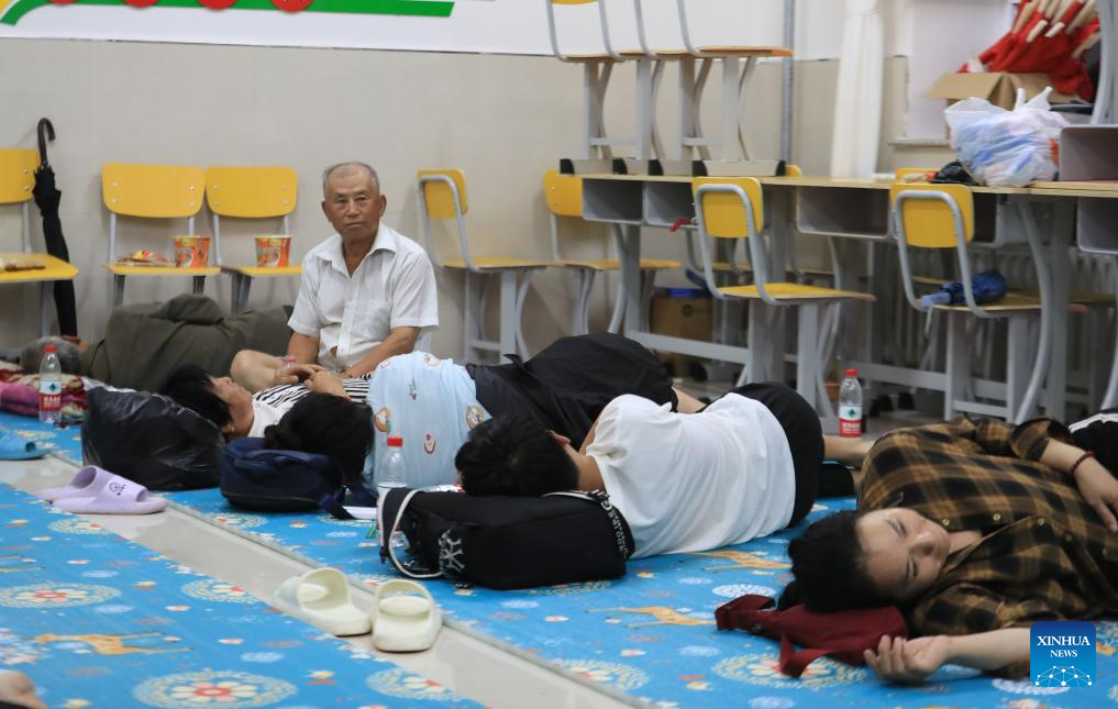 Affected residents rest at a temporary relocation site in a primary school in Jianchang County of Huludao City, northeast China's Liaoning Province, Aug. 21, 2024.