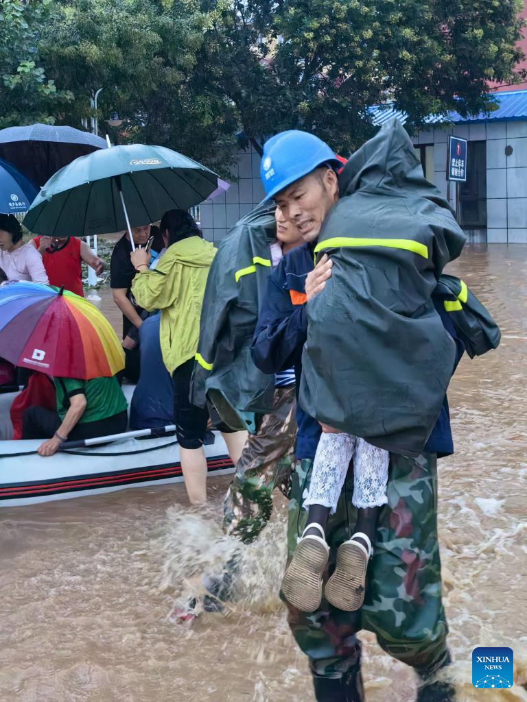 Staff members of Jianchang County branch of State Grid Corporation of China help evacuate residents in Jianchang County of Huludao City, northeast China's Liaoning Province, Aug. 20, 2024.