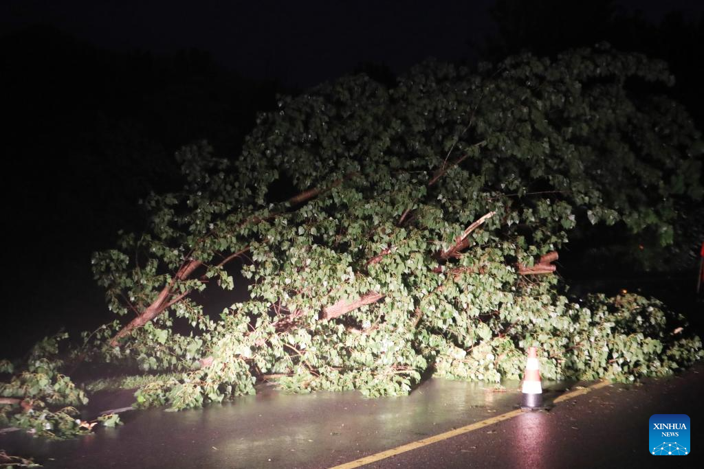 This photo taken on Aug. 20, 2024 shows a fallen tree on a road to Leijiadian Township in Jianchang County of Huludao City, northeast China's Liaoning Province.