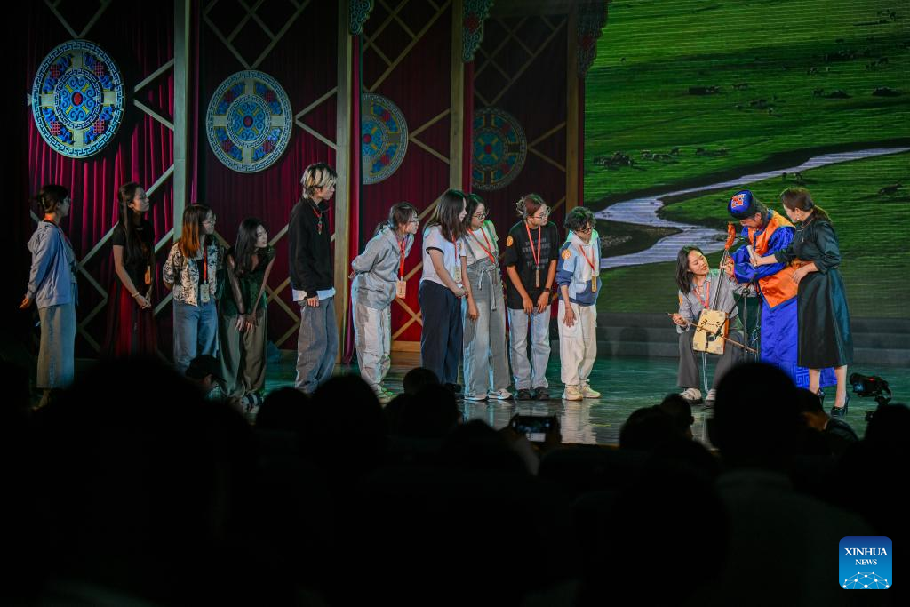 Students attending a cross-Strait journalism camp learn to play the horsehead fiddle, a traditional bowed stringed instrument, in Hohhot, north China's Inner Mongolia Autonomous Region, Aug. 21, 2024. A cross-Strait journalism camp for university students opened on Tuesday in the city of Hohhot, with approximately 200 students from both the mainland and Taiwan in attendance.
