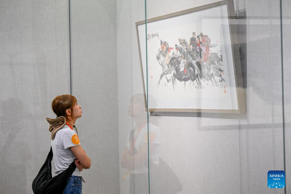 A student attending a cross-Strait journalism camp visits Inner Mongolia Art Museum in Hohhot, north China's Inner Mongolia Autonomous Region, Aug. 21, 2024. A cross-Strait journalism camp for university students opened on Tuesday in the city of Hohhot, with approximately 200 students from both the mainland and Taiwan in attendance.