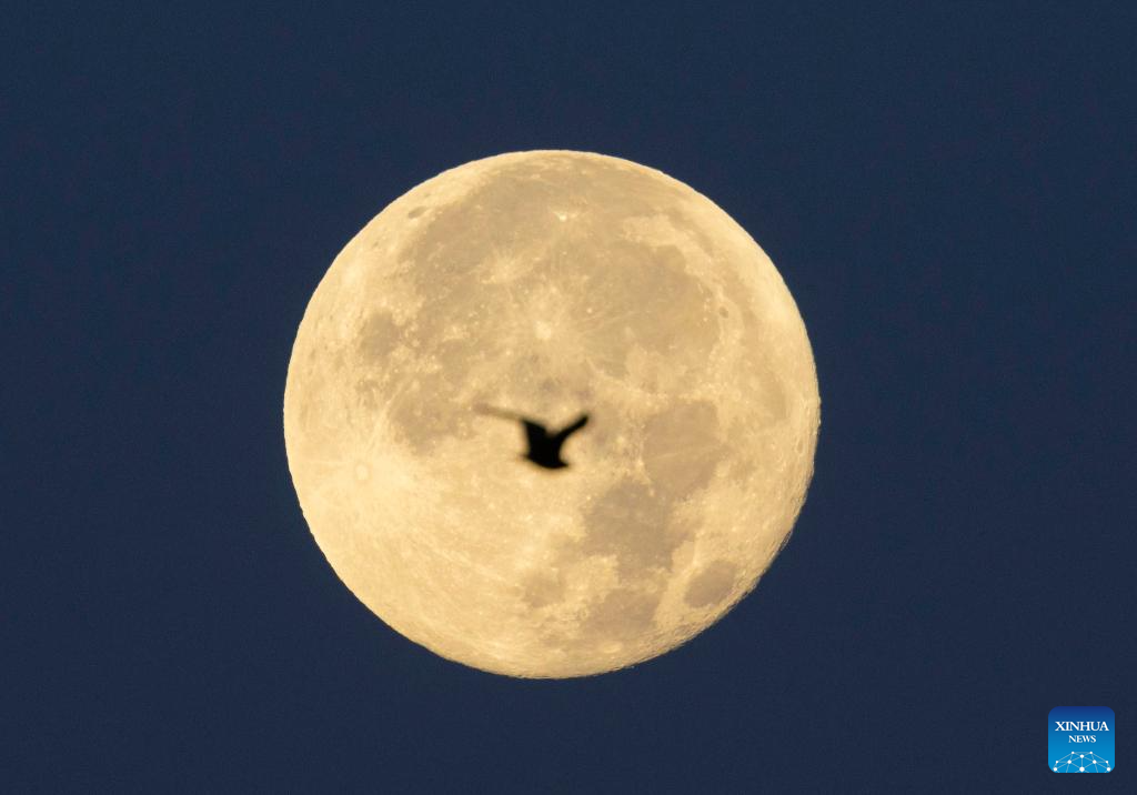 A bird flies in front of the full moon in Toronto, Canada, on Aug. 20, 2024. (Photo by Zou Zheng/Xinhua)