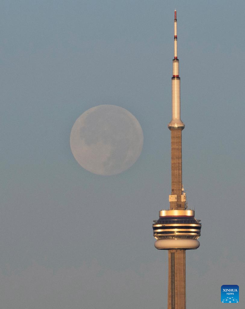 A full moon is seen with the Canadian National Tower at sunrise in Toronto, Canada, on Aug. 20, 2024. (Photo by Zou Zheng/Xinhua)