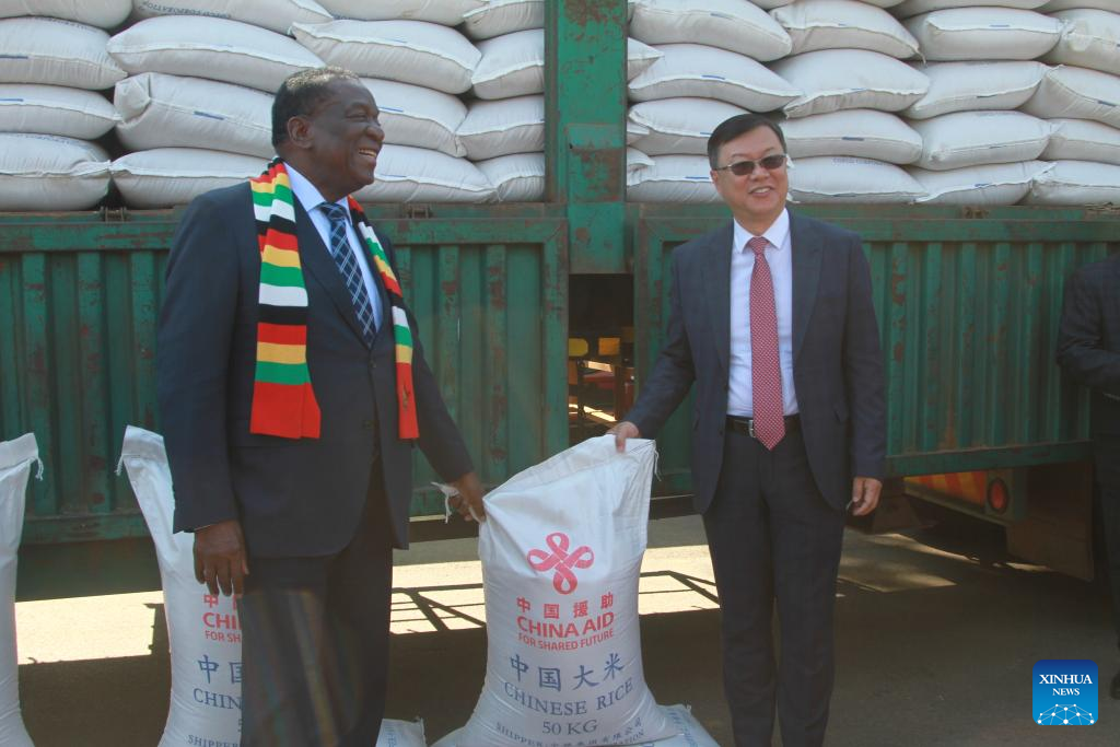 Chinese Ambassador to Zimbabwe Zhou Ding handed over the 1,760 metric tons of rice to Zimbabwean President Emmerson Mnangagwa at a ceremony at the State House in Harare, the capital of Zimbabwe.