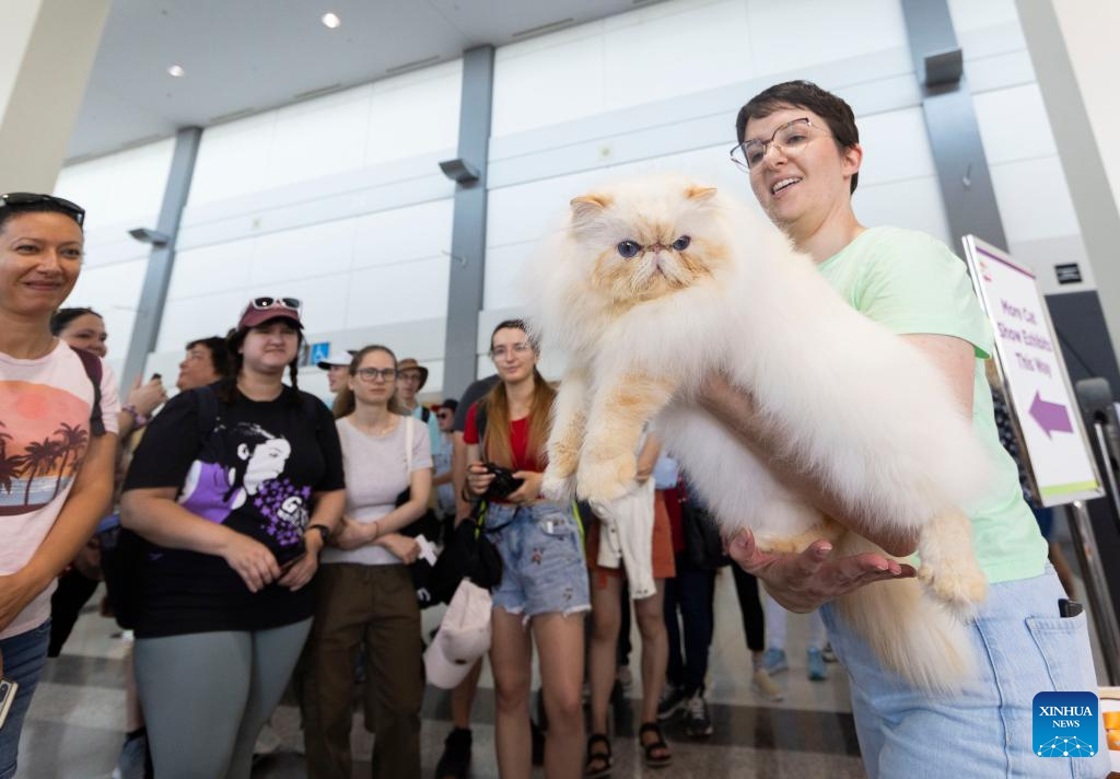 A judge checks a pet cat during the Cat Show at the 2024 Canadian National Exhibition (CNE) in Toronto, Canada, on Aug. 24, 2024. More than 100 pet cats across Canada participated in this annual event from Aug. 24 to 25. (Photo by Zou Zheng/Xinhua)