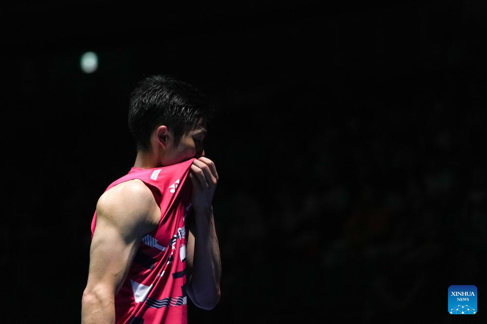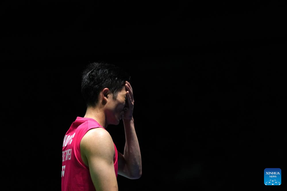 Chou Tien-Chen of Chinese Taipei reacts during the men's singles final match against Alex Lanier of France at the Japan Badminton Open 2024 in Yokohama, Japan, on Aug. 25, 2024. (Xinhua/Zhang Xiaoyu)