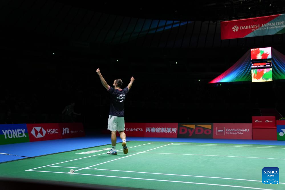 Alex Lanier of France celebrates after winning the men's singles final match against Chou Tien-Chen of Chinese Taipei at the Japan Badminton Open 2024 in Yokohama, Japan, on Aug. 25, 2024. (Xinhua/Zhang Xiaoyu)