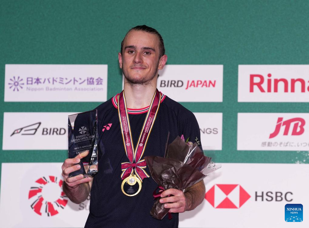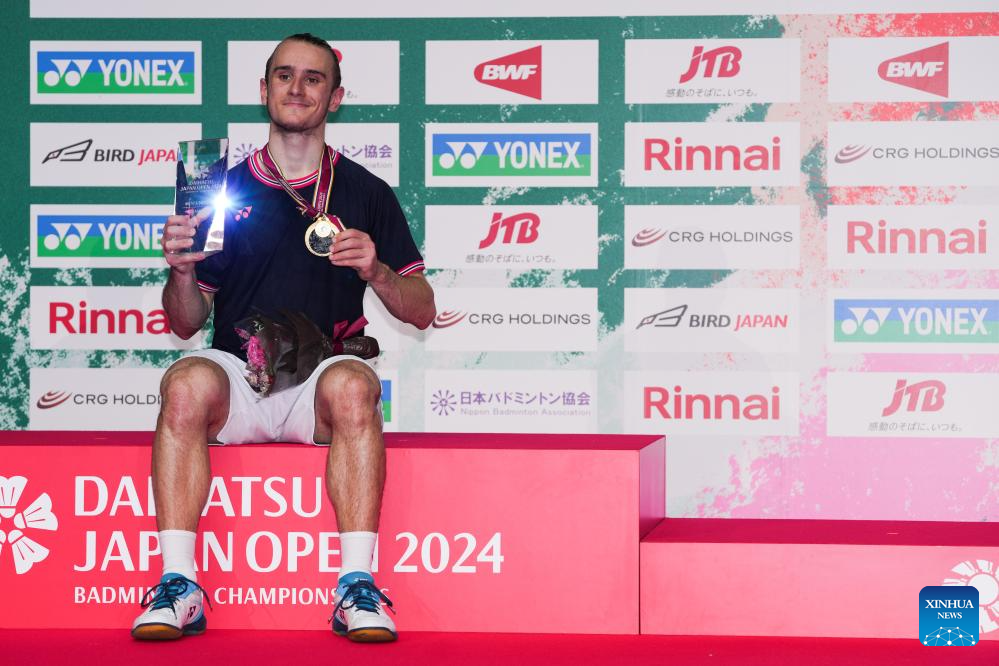 Alex Lanier of France poses for photos during the victory ceremony for the men's singles event at the Japan Badminton Open 2024 in Yokohama, Japan, on Aug. 25, 2024. (Xinhua/Zhang Xiaoyu)